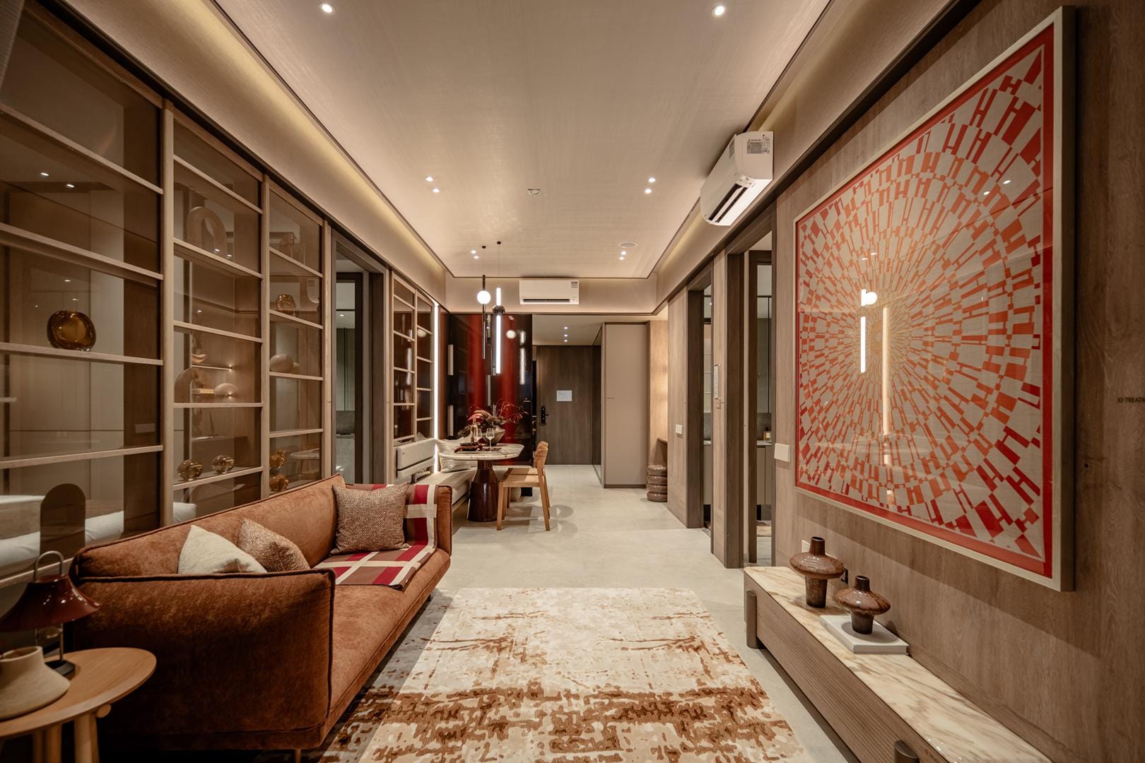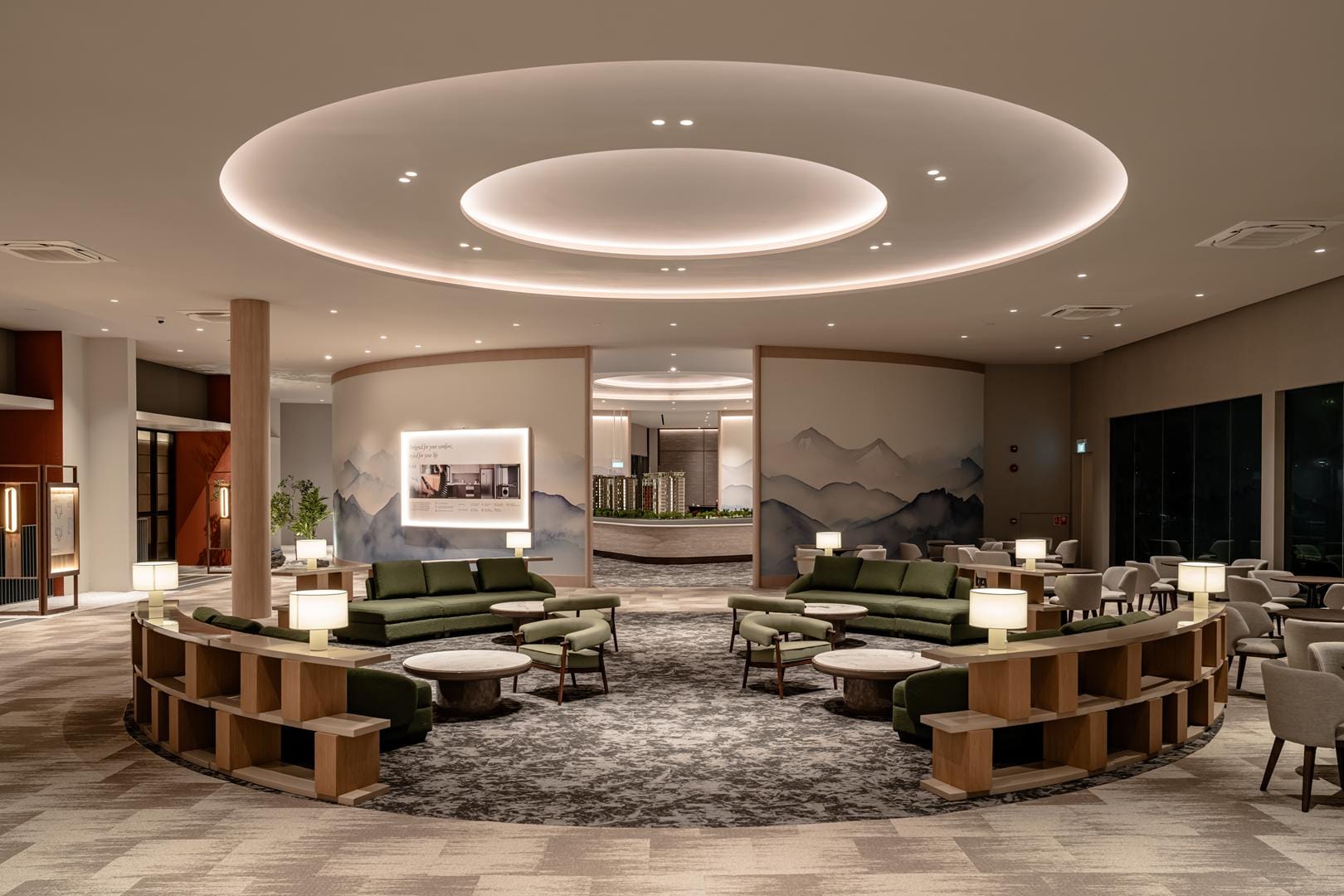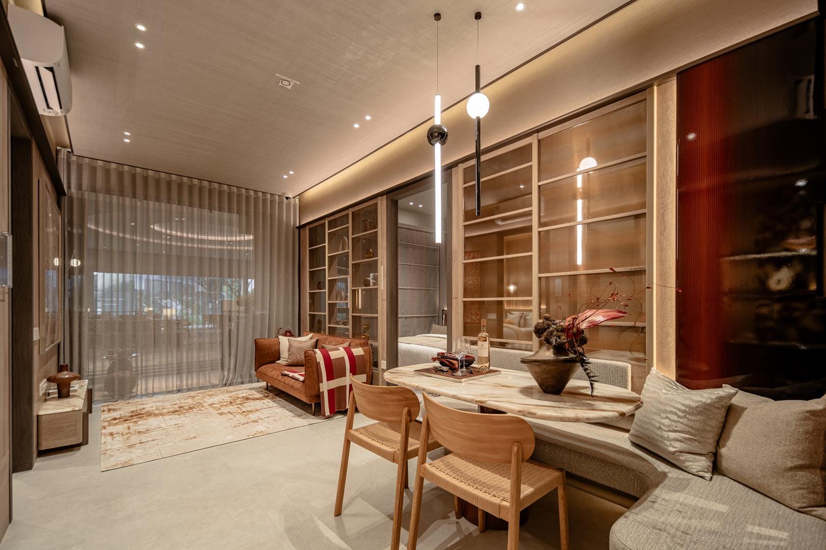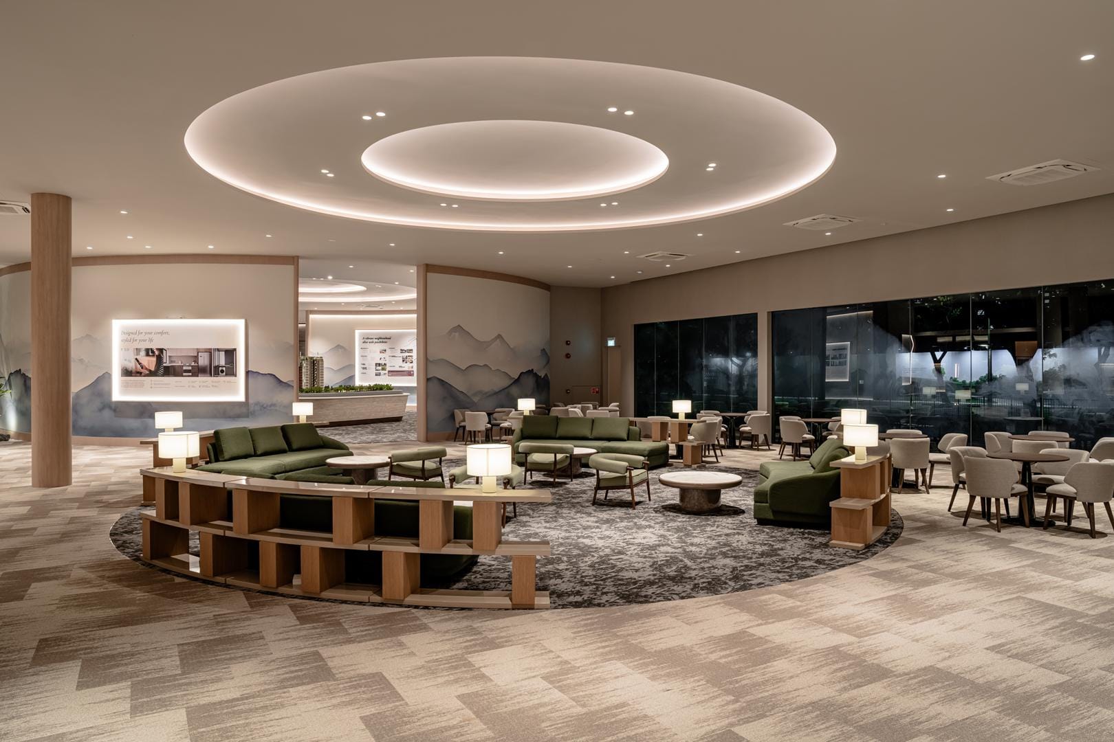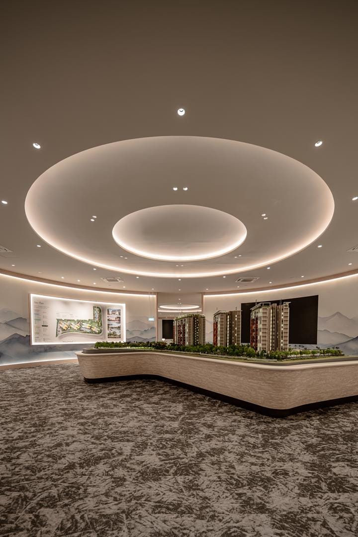 The design goes beyond illumination. Strategic layers of light highlight materials, textures, and interior details, allowing potential homeowners to imagine how these spaces could feel in daily life. Instead of simply presenting floor plans and finishes, the gallery immerses people in atmosphere.