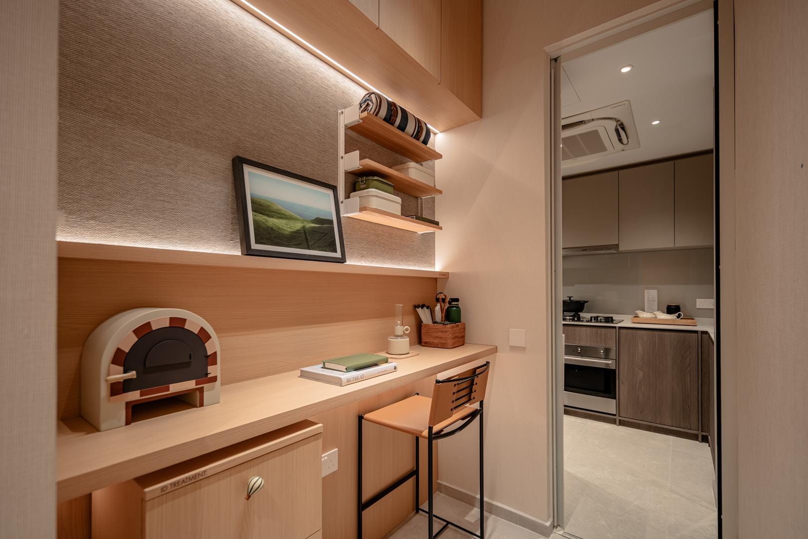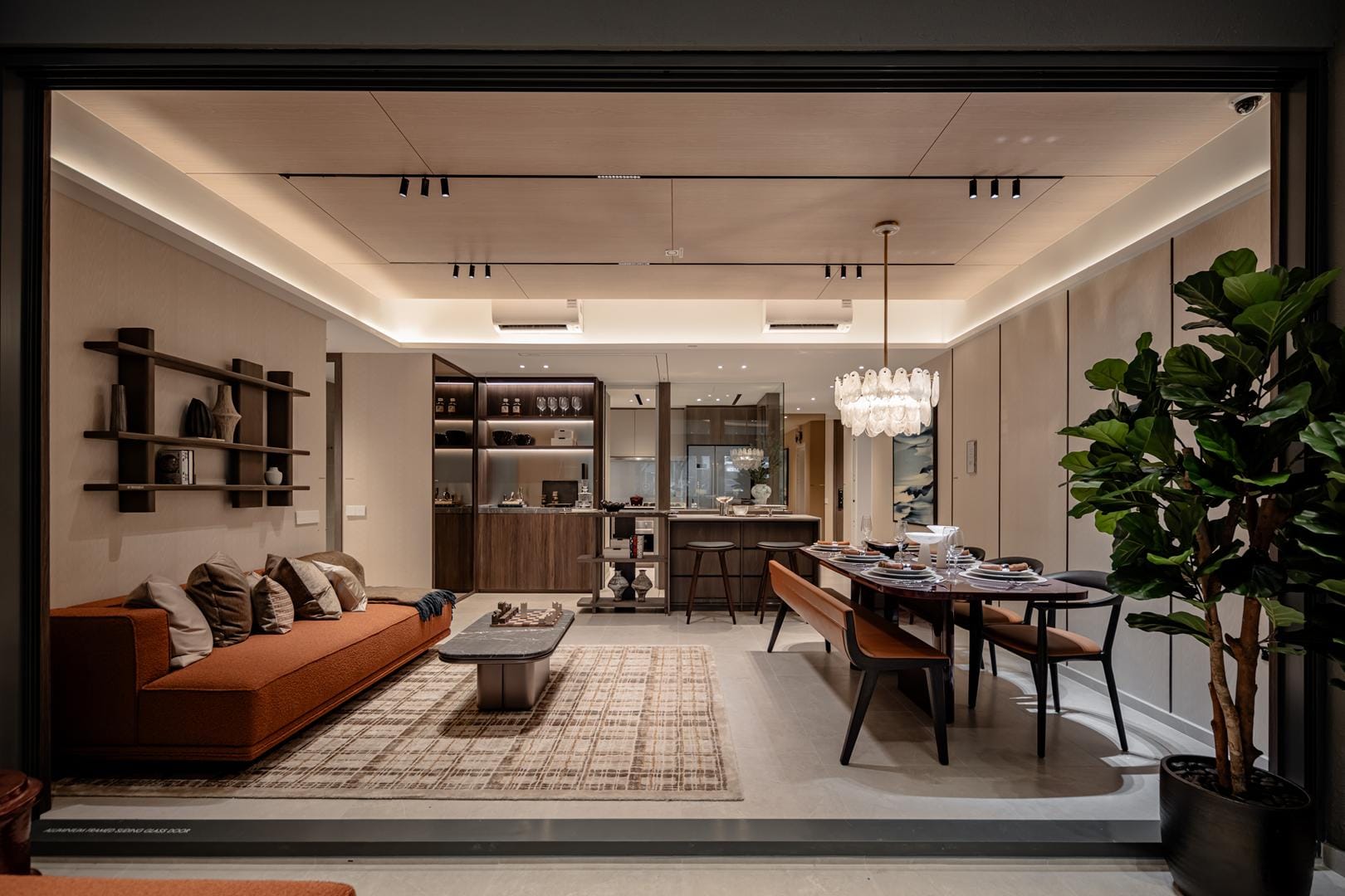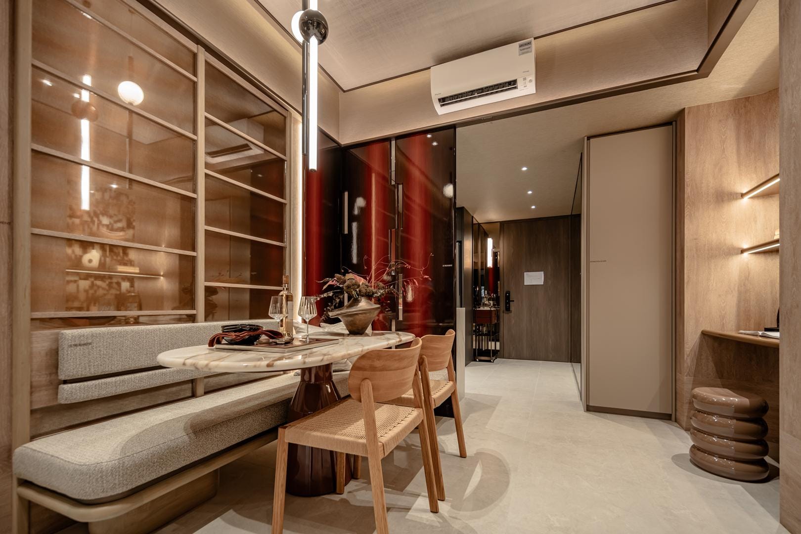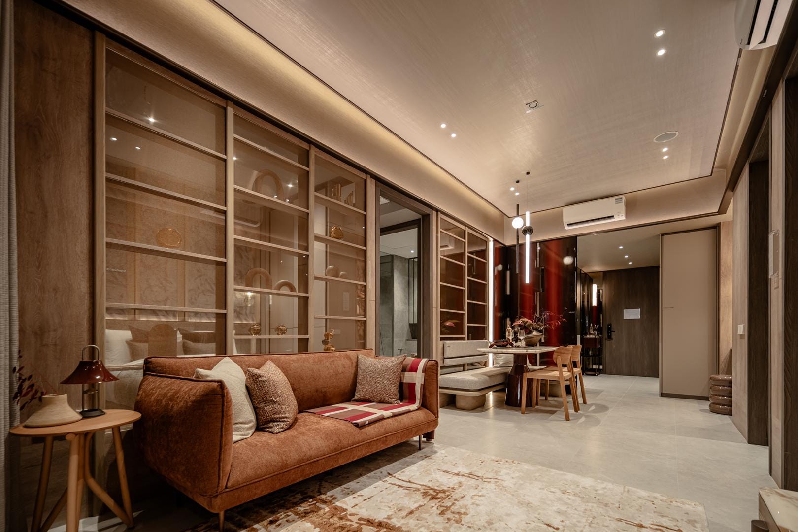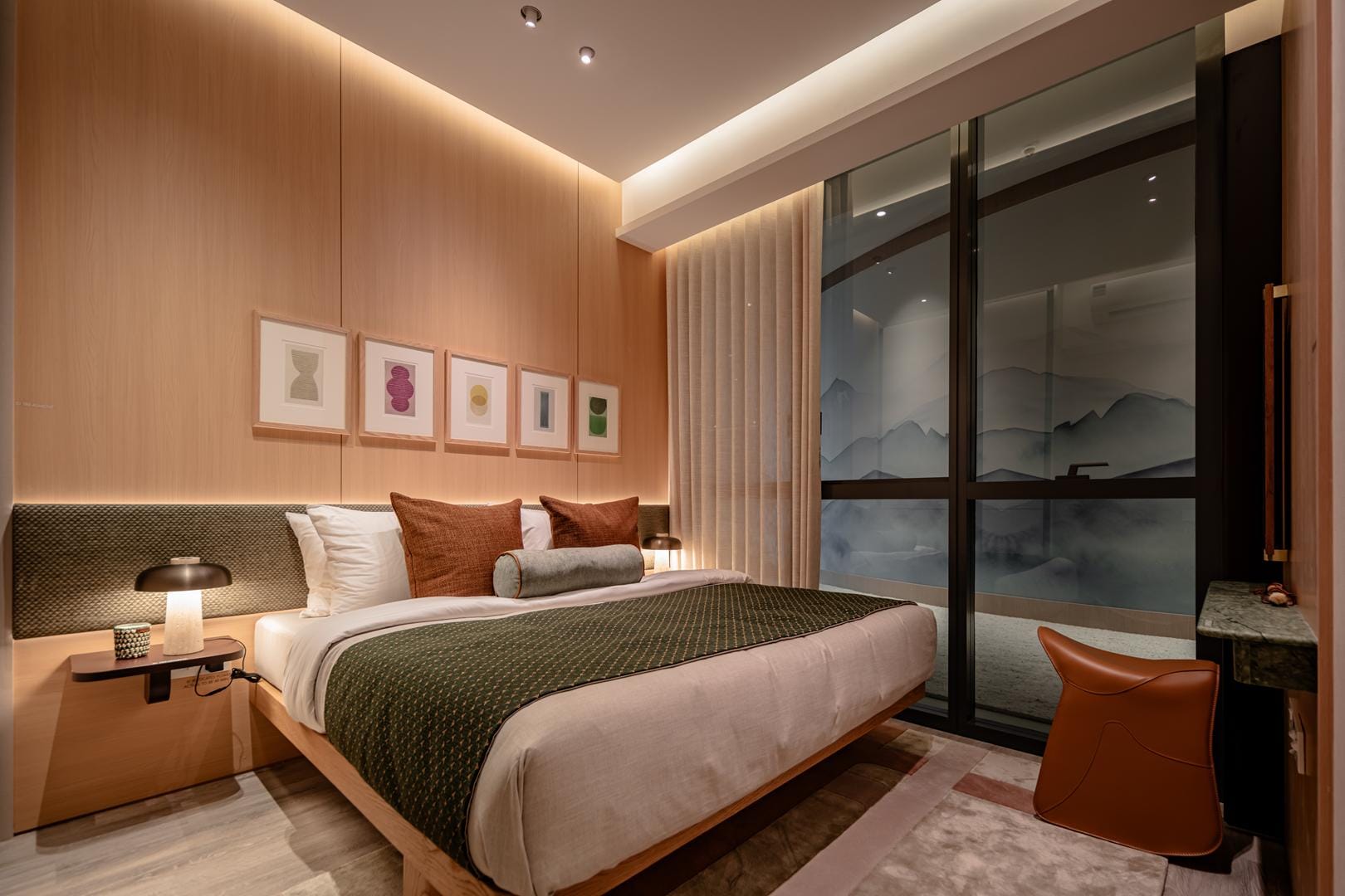 The design goes beyond illumination. Strategic layers of light highlight materials, textures, and interior details, allowing potential homeowners to imagine how these spaces could feel in daily life. Instead of simply presenting floor plans and finishes, the gallery immerses people in atmosphere.
