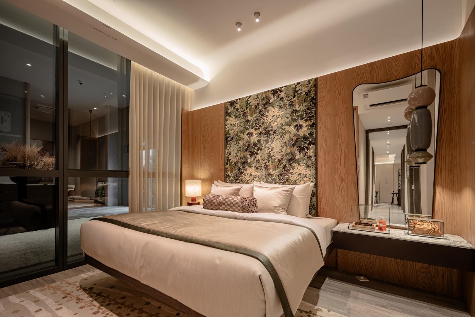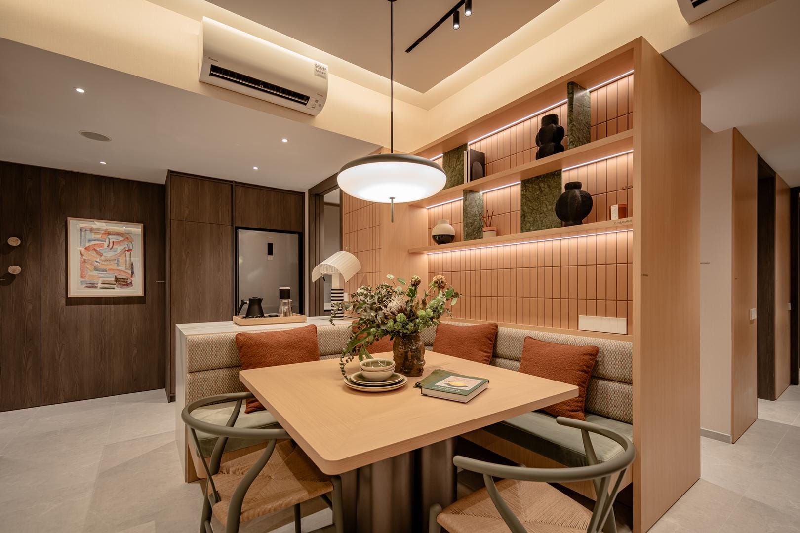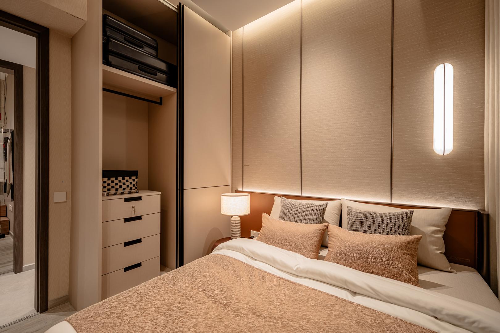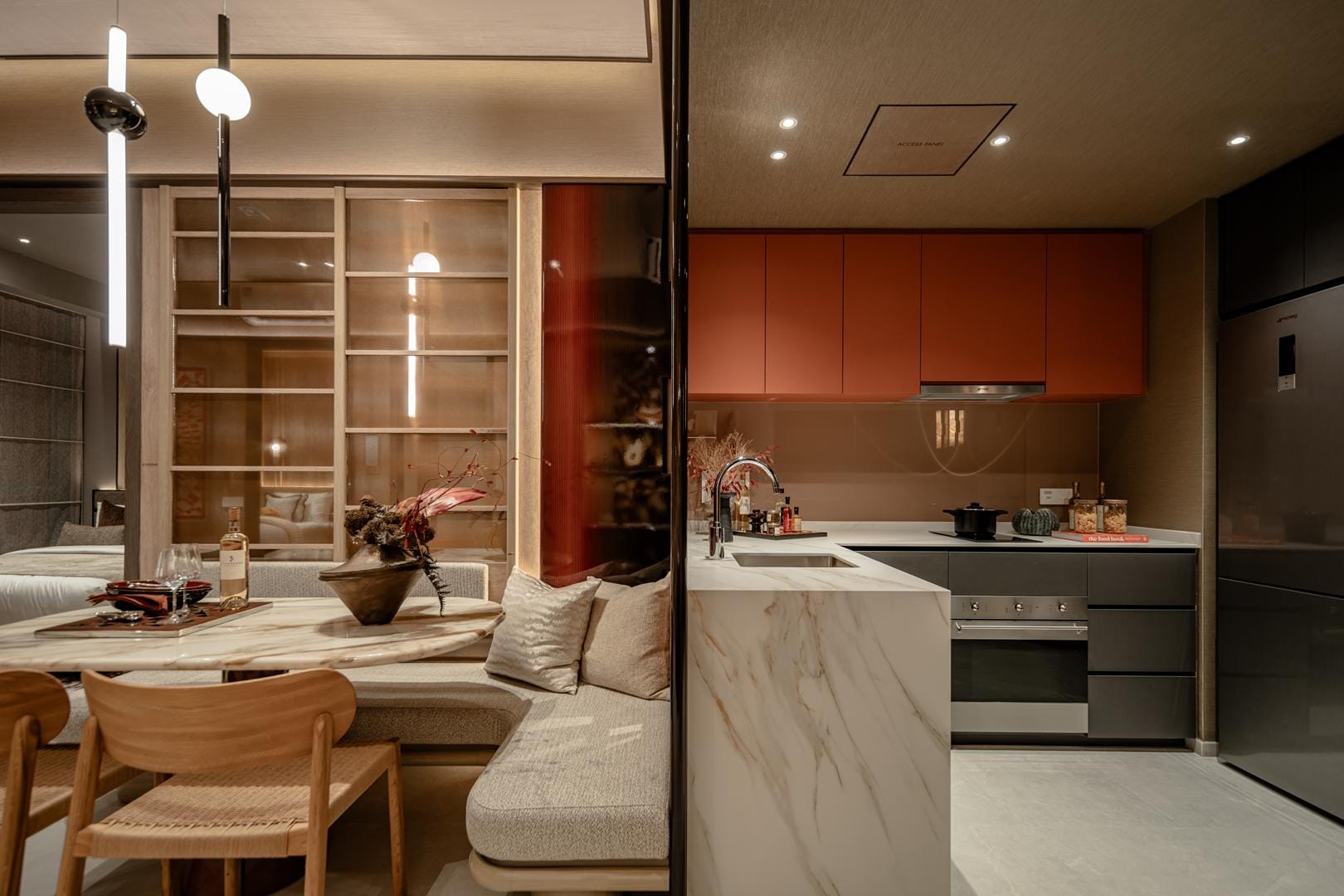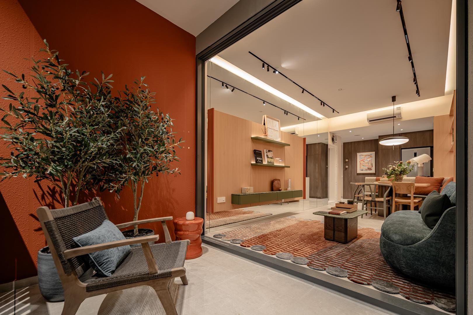The design goes beyond illumination. Strategic layers of light highlight materials, textures, and interior details, allowing potential homeowners to imagine how these spaces could feel in daily life. Instead of simply presenting floor plans and finishes, the gallery immerses people in atmosphere.