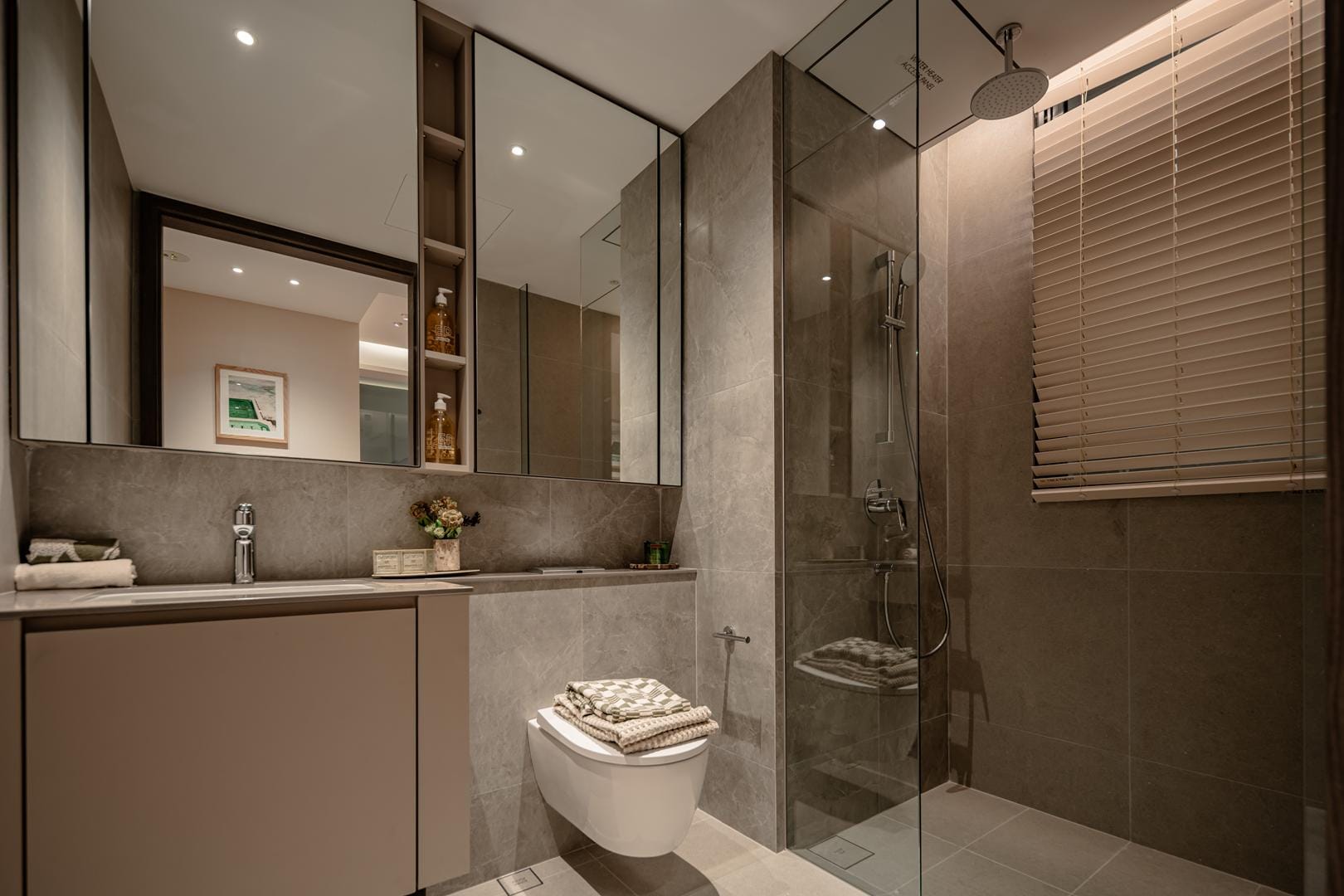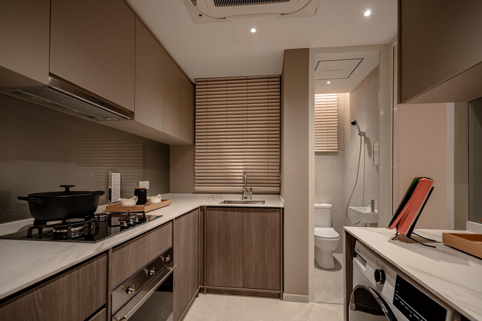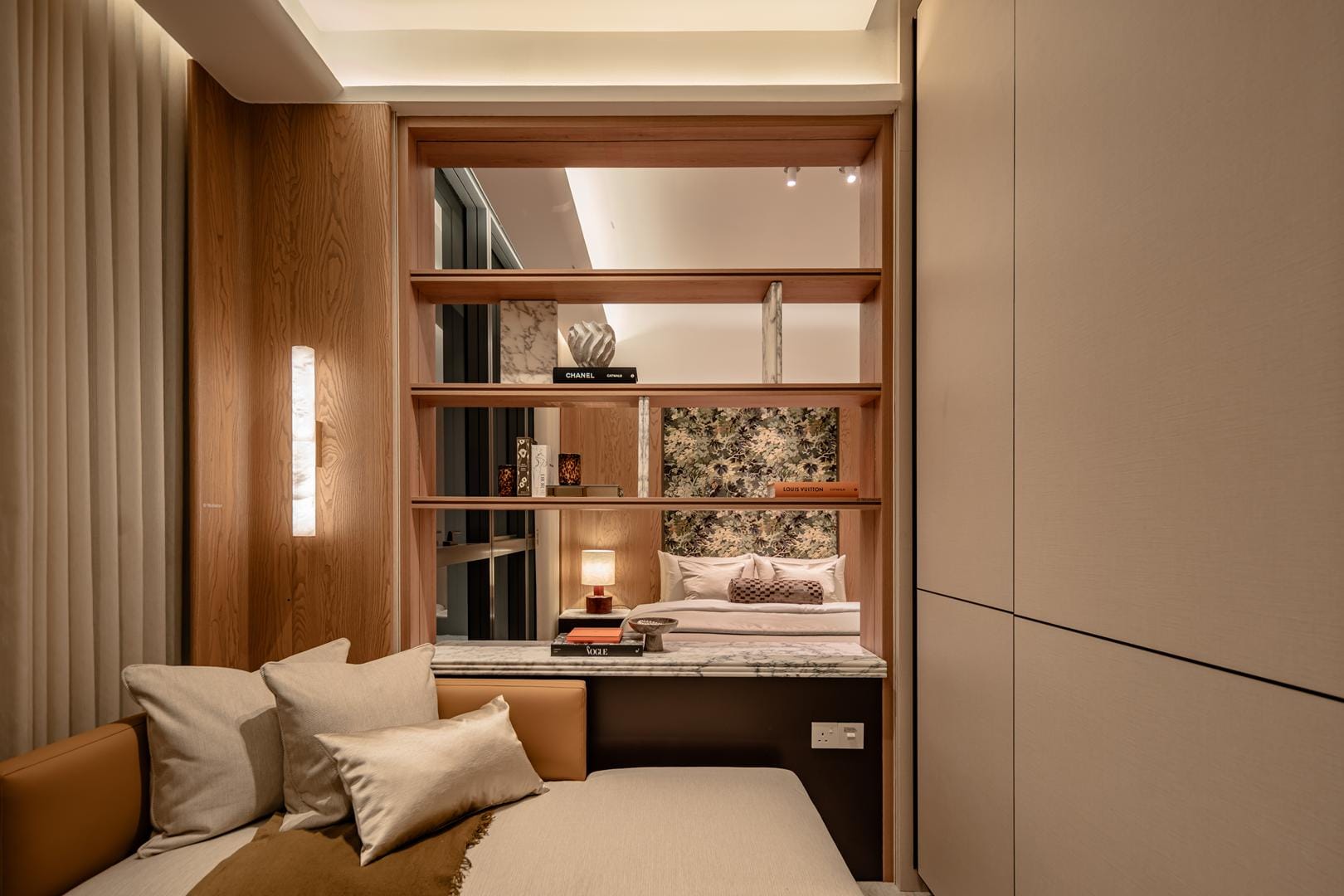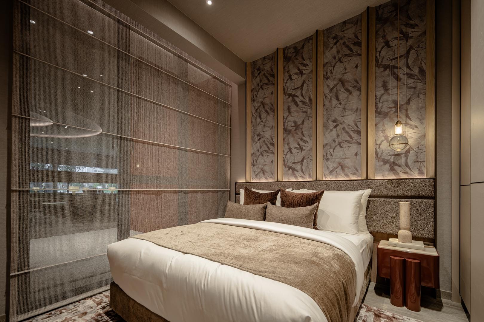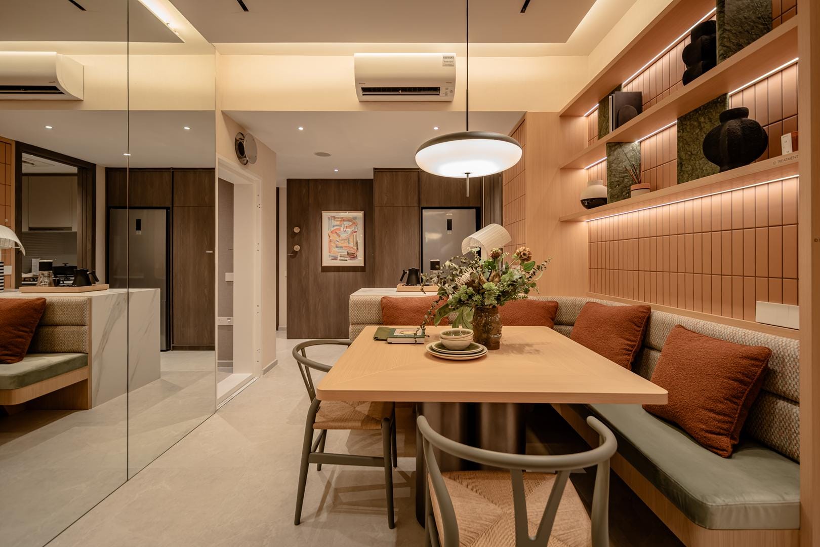 The design goes beyond illumination. Strategic layers of light highlight materials, textures, and interior details, allowing potential homeowners to imagine how these spaces could feel in daily life. Instead of simply presenting floor plans and finishes, the gallery immerses people in atmosphere.
