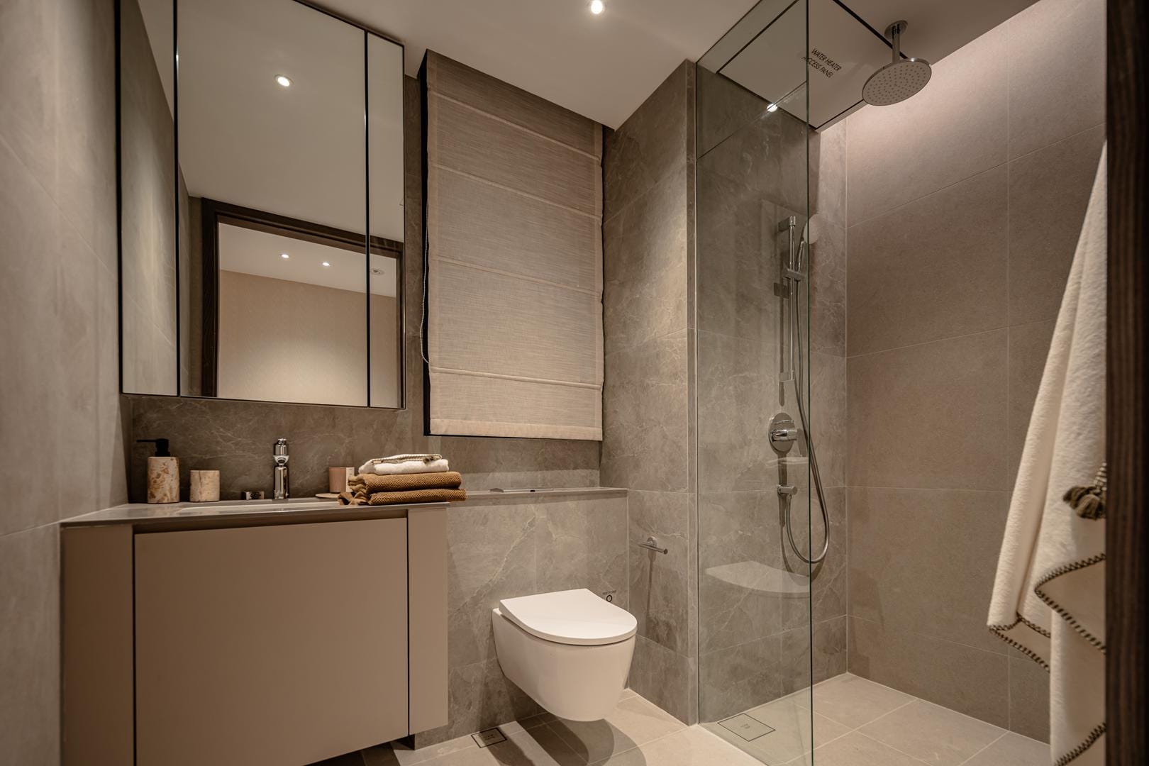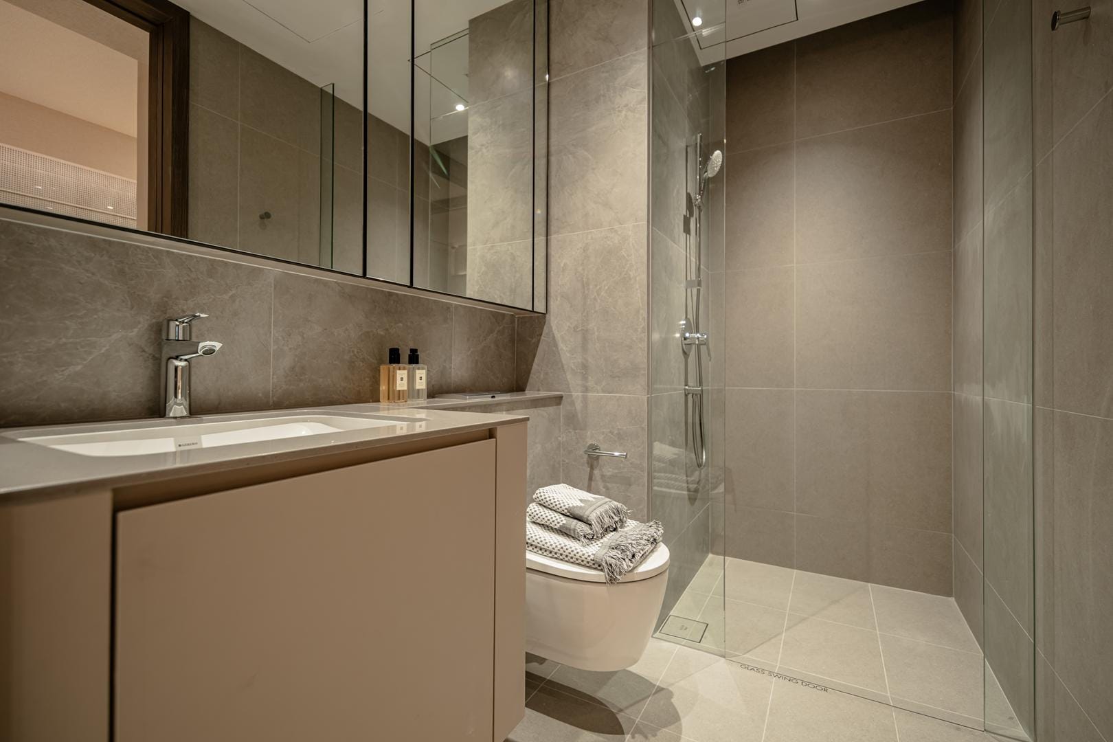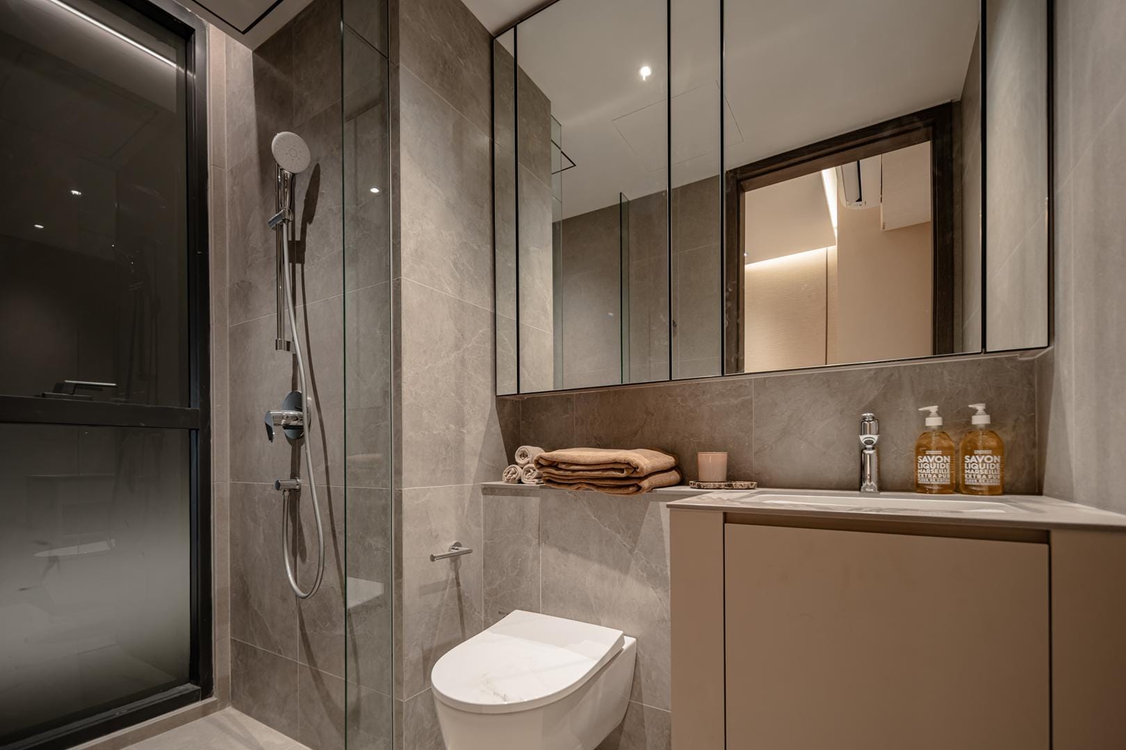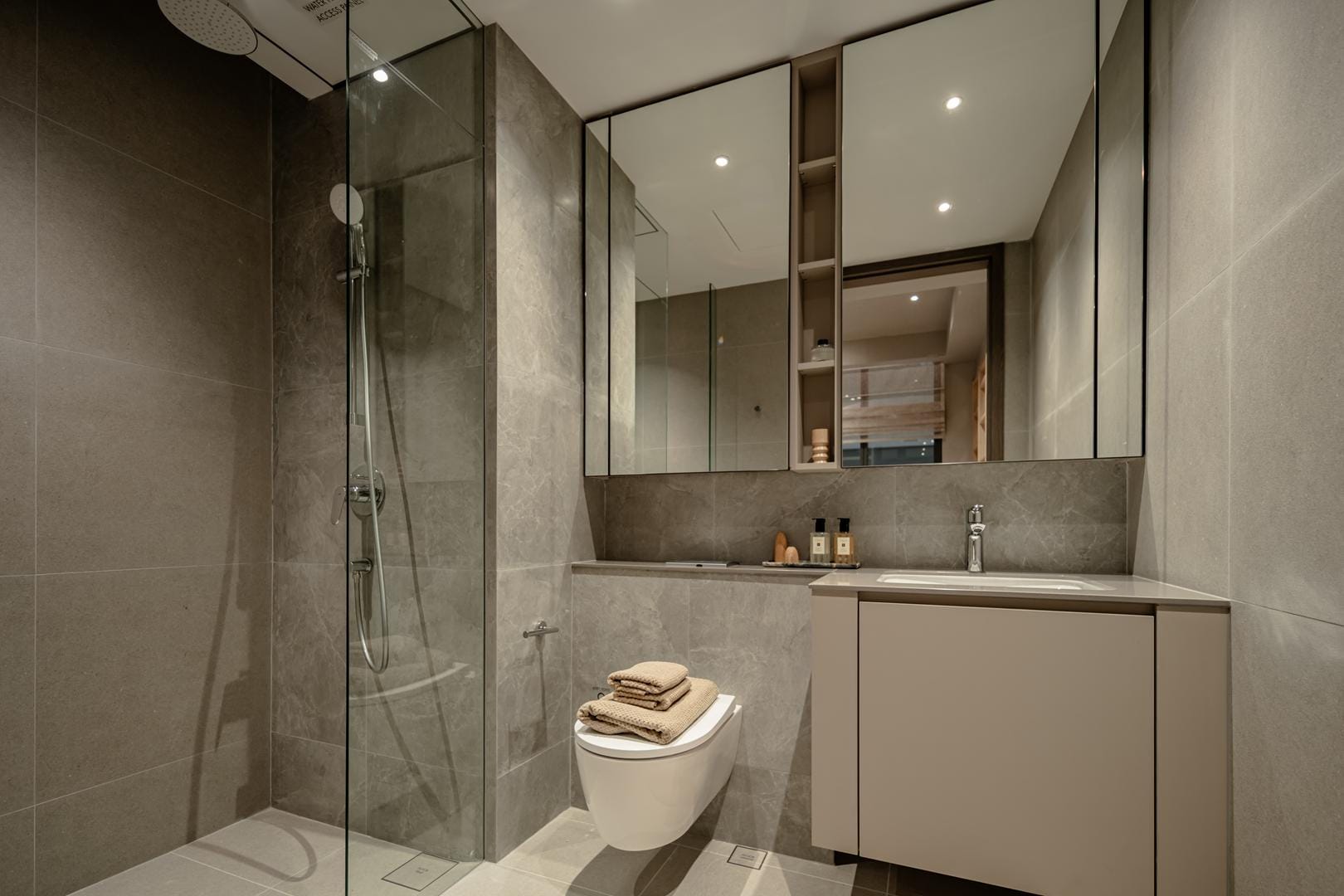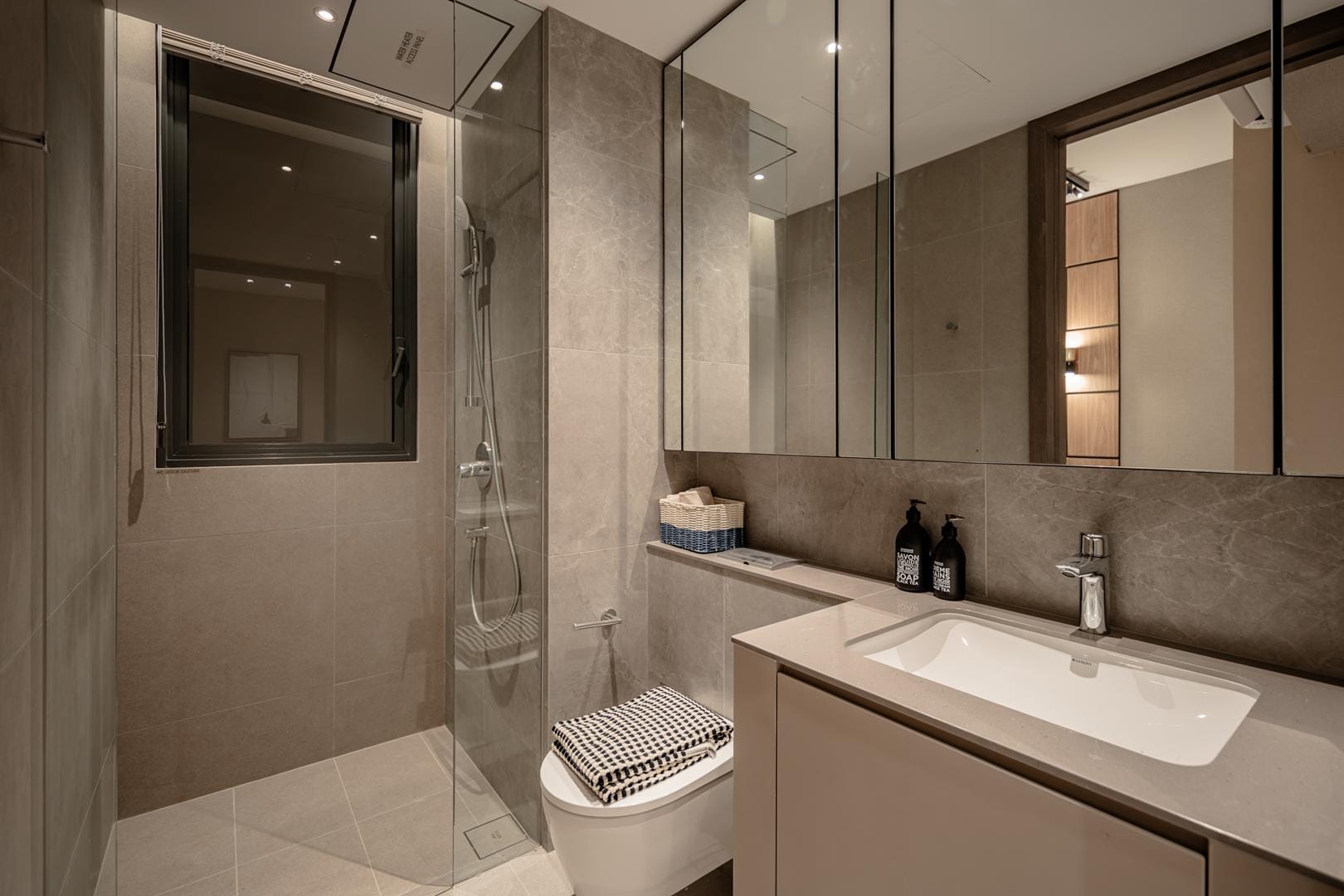 The design goes beyond illumination. Strategic layers of light highlight materials, textures, and interior details, allowing potential homeowners to imagine how these spaces could feel in daily life. Instead of simply presenting floor plans and finishes, the gallery immerses people in atmosphere.