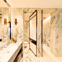 A standout feature is the exclusive master bedroom, transformed into a tranquil oasis with ambience lighting and a water-wave designer pendant light. The customized oyster pearl wall finish evokes the calmness of an underwater sanctuary, providing a peaceful retreat from the urban buzz.